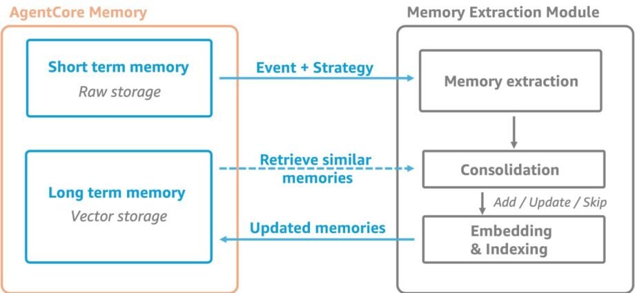 - Abstracted storage: AgentCore Memory handles the storage complexity for short- and long-term information, without requiring developers to manage underlying infrastructures.