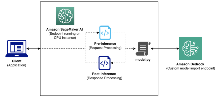 The following inference flow diagram illustrates how Salesforce maintained their existing application interfaces while using Amazon Bedrock serverless capabilities. Client requests flow through their established preprocessing layer for business logic like prompt formatting before reaching Amazon Bedrock, with postprocessing applied to the raw model output. To handle complex processing requirements, they deployed lightweight SageMaker CPU containers that act as intelligent proxies—running their custom model.py logic while forwarding the actual inference to Amazon Bedrock endpoints. This hybrid architecture preserves their existing tooling framework: their prediction service continues calling SageMaker endpoints without routing changes, and they retain mature SageMaker monitoring and logging for preprocessing and postprocessing logic. The trade-off involves an additional network hop adding 5–10 millisecond latency and the cost of always-on CPU instances, but this approach delivers backward-compatibility with existing integrations while keeping the GPU-intensive inference fully serverless through Amazon Bedrock.