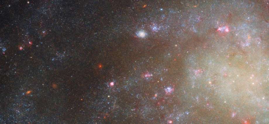 The data used to create this portrait were drawn from two complementary observing programs. The first took a broad view of 50 nearby galaxies, leveraging Hubble’s ability to observe light from the ultraviolet to the near-infrared in order to study star formation in these galaxies. The second program examined many of the same nearby galaxies as the first, narrowing in on a particular wavelength of red light called H-alpha. Star-forming nebulae are powerful producers of H-alpha light, and several of these regions can be identified across NGC 45 by their bright pink-red color.