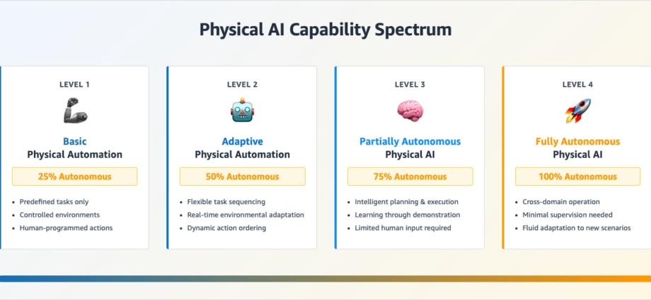 - Level 3: Partially Autonomous Physical AI: Here, systems demonstrate intelligent behavior, including planning, executing, and adapting tasks with limited human input. Robots that learn new processes through demonstration highlight this emerging autonomy.