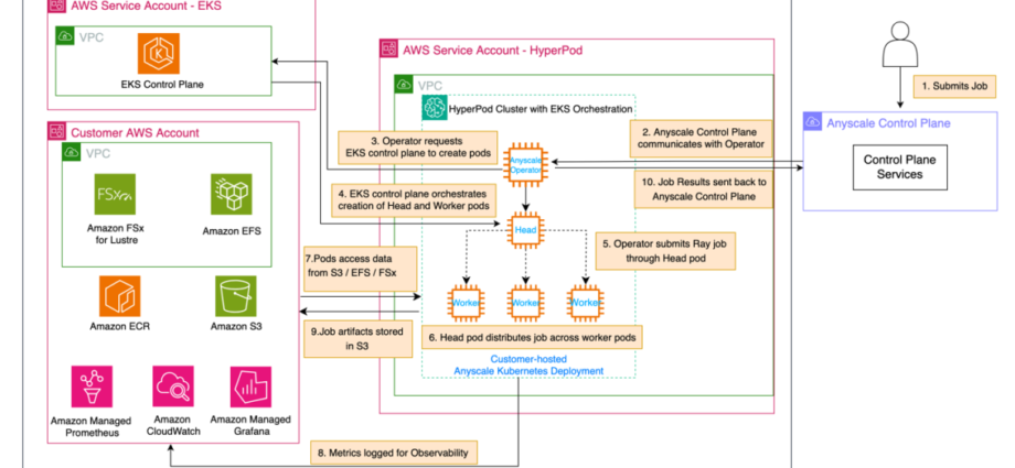- The Anyscale Control Plane communicates this job to the Anyscale Operator within the SageMaker HyperPod cluster in the SageMaker HyperPod virtual private cloud (VPC).
