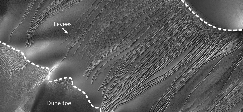 During the Martian winter, when temperatures plunge to around minus 120 degrees Celsius, ice accumulates on the dunes. As spring approaches, the sun warms the slopes and large ice blocks — sometimes a meter long — break loose. Because Mars has a thin atmosphere and a sharp temperature difference between warm sand and the ice, the underside of these blocks instantly turns to gas in a process known as sublimation. Since gas takes up far more space than solid ice, the pressure builds rapidly, making the ice appear to “explode.”
